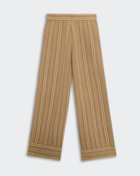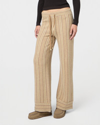 - Women’s cashmere stripe lounge pant - Mid-weight - Vertical stripe jacquard - Elasticized waistband with drawstring - Contrast horizontal stripe band at pant cuff - Signature gir branding at center back - 9 Gauge - 100% cashmere - Premium cashmere sourced from inner Mongolia, manufactured in China - ELLA IS 5' 11" / 180 CM and is wearing a size small.