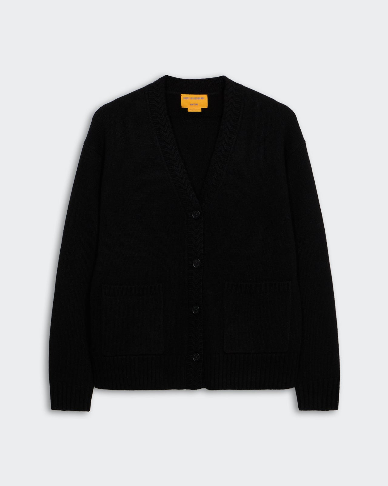 - Unisex fit to Men's sizing. Women should size down for a less oversized fit. - Medium-weight knit - Five-button closure - Racked rib stitch placket/neckline - Ribbed cuff and hem - Two front patch pockets with ribbed trim - Integral knitted branding - 100% Cashmere - Julia is 5' 9.5" / 177cm and is wearing a medium. - Premium cashmere sourced from inner Mongolia, manufactured in China
