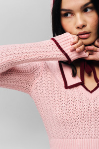 - Upgrade your wardrobe with the Charlotte Pullover. Our pointelle knit fabric adds a touch of luxury, while the collar detail with piping lining makes it stand out. - Composition: 50% Viscose 28% Polyester 22% Nylon - Thalita is wearing a size XS and is 5'9" with a 32" bust, 35" hips, and 23" waist