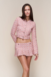 - The Claudine Mini Skirt offers a playful balance of structure and ease. Cut in Snow White tweed with pleated detailing and contrast buttons for dimension. Finished with pocket accents and a flattering low-rise fit. Designed to be worn as a full set with the matching cropped jacket or styled apart for everyday wear. - Composition: 50% Polyester, 20% Acrylic, 20% Wool, 10% Cotton - Alessandra is wearing a size XS and is 5'9" with a 32.5" bust, 36.5" hips, and 25" waist
