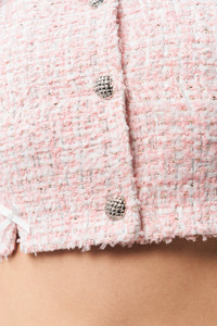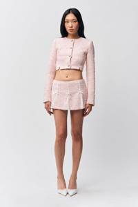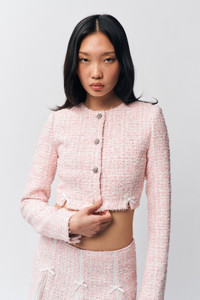 - Add a touch of elegance to your outfit with our cropped tweed Collette Jacket, featuring a subtle silver shimmer for a refined finish. The charming bow details on the hem and darts create a flattering silhouette, making this piece a perfect complement to any ensemble. Pair with the Arlo Corset & Emory Skirt for a full look. - Composition: 100% Polyester - Meishing is wearing a size S and is 5'10" with a 34" bust, 34" hips, and 24" waist