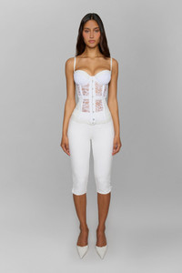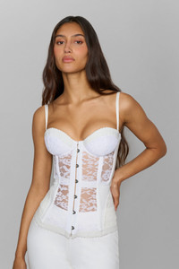 - Introducing the Esme Corset, your new go-to for elegance and structure. Beautifully crafted with lace details and boning throughout, it features a lightly padded bustier neckline. This style also offers removable straps, a lace-up back, and a front clasp closure for a customizable fit. - Composition: Shell: 55% Nylon 35% Cotton 10% Elastic Lace - Ainhoa is wearing a size S and is 5'9½" with a 34" bust, 34½" hips, and 24" waist