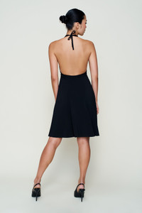 - A fluid halter silhouette with a plunging neckline and open back, tied softly at the neck. Designed in a draped A-line cut that moves with ease — a minimal take on the essential black dress. - Composition: 92% Polyester, 8% Spandex - Shannon is wearing a size S and is 5'9" with a 32" bust, 34.5" hips, and 24" waist