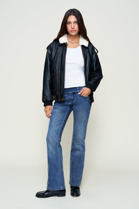 - A classic made new. The Hugo Bomber is cut from distressed black leather with a plush shearling collar, channeling an effortless mix of toughness and nostalgia. Its oversized fit is grounded by structured pockets, ribbed hem, and subtle worn-in edges that feel like a story already lived. Throw it over denim or a slip dress—the kind of piece that only gets better with time. - Composition: 100% Leather - Kayla is wearing a size S and is 5'8" with a 32" bust, 35" hips, and 24.5" waist