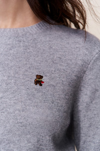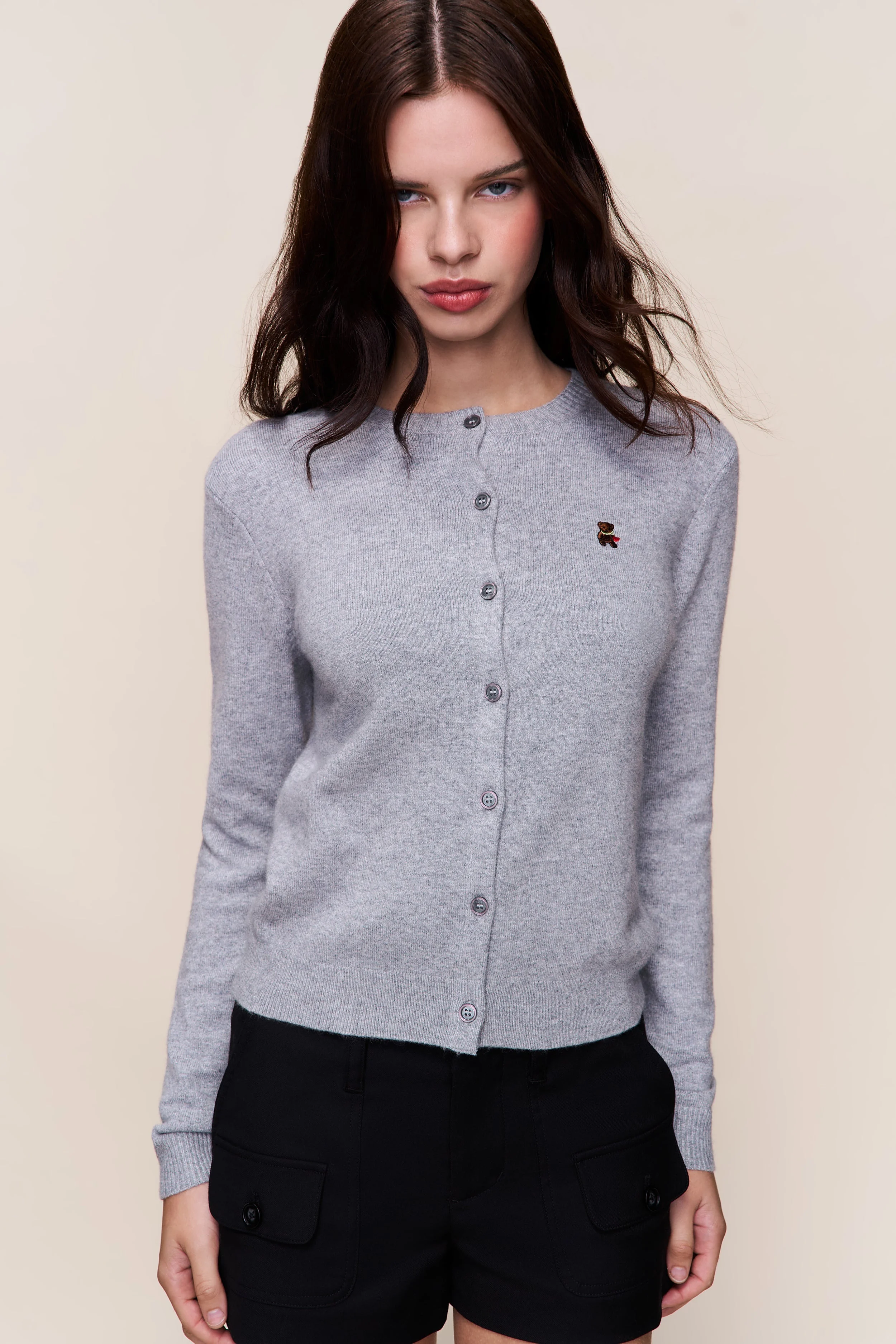 - The June Relaxed Wool Cardigan is crafted from soft wool-blend in a slightly cropped silhouette, finished with a button front and an embroidered teddy bear detail. Designed with a slightly relaxed fit, it offers a cozy yet polished take on everyday knitwear. - Composition: 45% Nylon, 45% Viscose, 5% Angora Wool, 5% Wool - Noa is wearing a size S and is 5'10" with a 29" bust, 35" hips, and 23.5" waist
