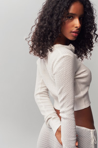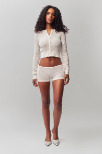 - Our Knit Side-Tie Shorts feature soft mohair construction and a fitted shape, finished with ties at each hip. - Slightly sheer - Composition: 100% Mercerized Cotton - Eileen is wearing a size S and is 5'9" with a 32" bust, 35" hips, and 25.5" waist
