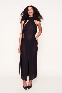 - Sleek and statement-making. The Koemi Dress features a halter neckline, sheer mesh paneling, and a front slit for fluid movement. Finished with a long draped tie and body-skimming fit. - Designed to turn heads, the Koemi Sheer Panel Dress features a high-neck halter silhouette with sheer mesh paneling that contours the body and reveals just enough. A high front slit adds movement and allure, while the sleek, body-skimming shape elongates the figure with understated elegance. - Composition: 100% Polyester - Eileen is wearing a size S and is 5'9" with a 32" bust, 35" hips, and 25.5" waist