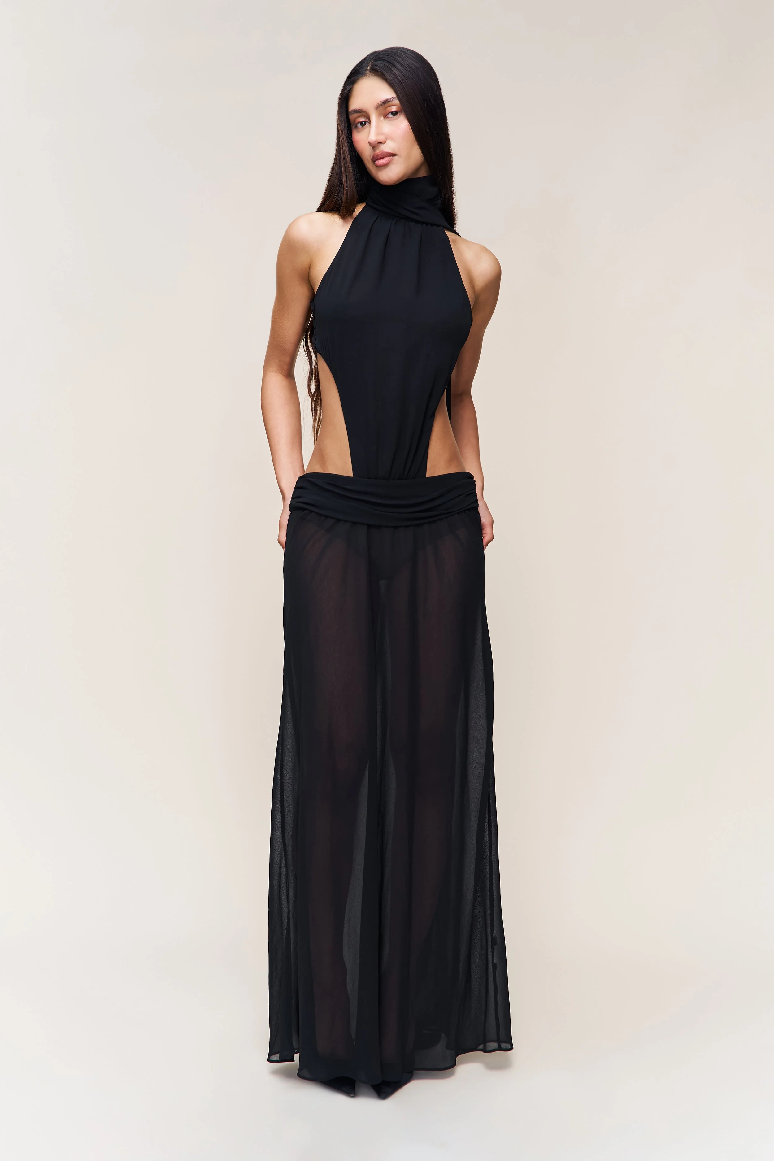 - The Marais Dress moves like a whisper—fluid, effortless, and impossibly alluring. Featuring a softly draped high neckline that frames the shoulders, and open sides that trace the waist in delicate curves. The sheer chiffon skirt floats with every step, balanced by a gathered hip that adds graceful shape. A study in contrasts—strength and softness, modern and timeless. - Composition: 100% Polyester - Sonali is wearing a size S and is 5'10" with a 31" bust, 35" hips, and 23" waist