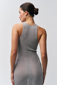 Yada is wearing a size XS and is 5'9" with a 32" bust, 34" hips, and 24" waist - Make a statement with our Odette Dress, crafted from shimmering slinky knit for a touch of glamour. This high neck maxi dress features a flattering fit that accentuates your silhouette, perfect for both day and night looks. The sparkly fabric catches the light beautifully, ensuring you stand out in any setting. - Matching undergarment included. - Composition: 72% Viscose 28% Metallic - Yada is wearing a size XS and is 5'9" with a 32" bust, 34" hips, and 24" waist