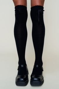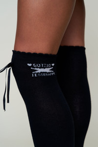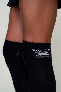 - The Knee High Sock adds a romantic, playful finish to the Guizio x Le Sserafim collaboration. Crafted in a soft stretch knit, the style features a scalloped edge, delicate satin bow tie accents, and the collab lock-up detail. Perfect for pairing with mini skirts, loafers, or ballet flats, it’s a sweet yet bold touch for everyday styling.