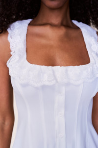 - The iconic Paloma set, reimagined as a one-piece. Lace-trimmed square neckline, fitted bodice, and soft flare through the skirt. Finished with an adjustable waist tie for shape. - Composition: 100% Polyester - Eileen is wearing a size S and is 5'9" with a 32" bust, 35" hips, and 25.5" waist