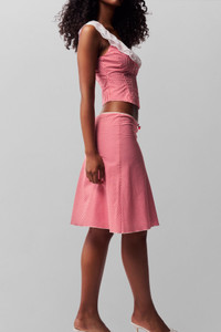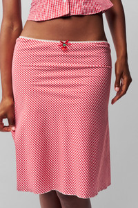 - Pull-on midi skirt featuring scalloped waist, a flounced hem, and an elastic waistband. - Composition: 100% Polyester - Dani is wearing a size S and is 5'10" with a 32" bust, 35" hips, and 25" waist