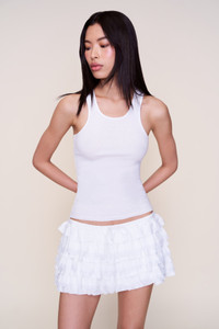 - Flirty and ultra-feminine, this ruffled mini skirt features cascading tiers of soft lace-trimmed layers and a drawstring waist for a playful, easy fit. Perfect for pairing with tanks, baby tees, or over swimwear. - Composition: 55% Linen, 45% Rayon - Beauty is wearing a size XS and is 5'10" with a 31" bust, 34.5" hips, and 24" waist