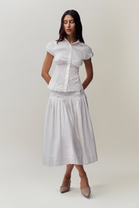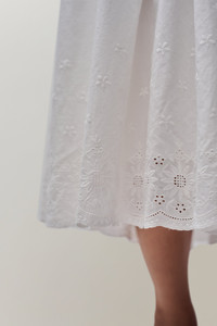 - Complete your look with our Rinka Maxi Skirt. Made from embroidered edge poplin, it features intricate embroidery details and a striking front panel for a touch of sophistication. The convenient zipper opening ensures a smooth, graceful fit. - Composition: 100% Cotton - Sonali is wearing a size S and is 5'10" with a 31" bust, 35" hips, and 23" waist