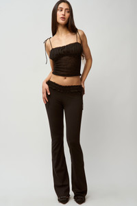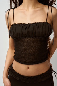 - Have you met our Ruched Chiffon Knit Tank? We especially love its hybrid construction – a ruched chiffon bust tops a fuzzy knit mohair bodice for a bit of cozy texture. The charming ruffle trim and tie straps are perfect paired with the Ruched Side-Tie Stretch Pants. - Self-tie shoulder straps - Ruffle trim - Composition: 40% Nylon, 32% Mohair, 28% Merino wool - Sonali is wearing a size S and is 5'10" with a 31" bust, 35" hips, and 23" waist