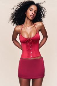 - Meet your favorite skirt, the Satin Mini. Designed with radiant satin construction, it's short and sweet, cut with a mid-rise that hugs the hips. Pair it with our Satin Corset or the Celestial top for a glossy look from head-to-toe. - Concealed side zip - Front and back princess seams - Composition: Lined 97% Triacetate, 3% Spandex - Eileen is wearing a size S and is 5'9" with a 32" bust, 35" hips, and 25.5" waist