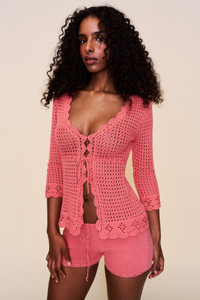 - The Scallop Short is crafted from a lightweight open knit with a stretch waistband and subtle scalloped edging. Wear it with the matching Rosalie Top or styled solo for a laid-back summer look. - Composition: 55% Acrylic, 45% Cotton - Eileen is wearing a size S and is 5'9" with a 32" bust, 35" hips, and 25.5" waist
