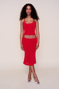 - Introducing the Selene Midi Skirt, created from our new spandex blend fabric with an elegant sheen. This midi skirt offers a low rise and elastic waistline for comfortable wear. An effortless staple to elevate your wardrobe effortlessly. - Composition: 95% Polyester, 5% Spandex - Eileen is wearing a size S and is 5'9" with a 32" bust, 35" hips, and 25.5" waist