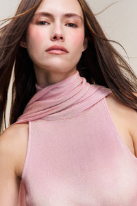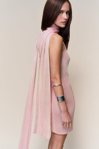 - A sleeveless mini dress with an attached scarf that can be styled multiple ways—draped, tied, or wrapped to your liking. Crafted from a metallic stretch knit that glimmers under the light and molds softly to the body. Minimal yet striking—made for evening moments. - Composition: 72% Viscose, 28% Metallic - Alessandra is wearing a size XS and is 5'9" with a 32.5" bust, 36.5" hips, and 25" waist