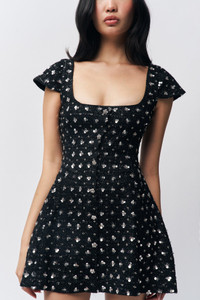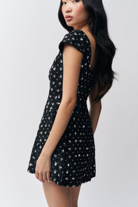 - The Shiloh Dress blends sophistication and sparkle, crafted from luxe tweed fabric with eye-catching silver embellishments. This mini-length dress features elegant cap sleeves, making it perfect for day-to-night transitions. - Composition: 100% Polyester - Meishing is wearing a size XS and is 5'10" with a 34" bust, 34" hips, and 24" waist