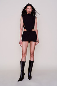 - The Shyla Mini Dress features a fluid, high-neck silhouette with dramatic open sides and a twisted front detail that meets at the waist. The skirt drapes low on the hips, balanced by a barely-there back with adjustable ties. Fully lined. Pull-on style. - Beauty is wearing a size XS and is 5'10" with a 31" bust, 34.5" hips, and 24" waist