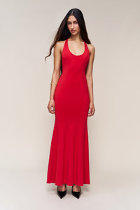 - A halter-style gown with an open back and floor-length silhouette. Designed in a fluid, stretch fabric that moves with the body. The scarf-style tie can be wrapped or knotted at the neck for a customized look. Bold, refined, and effortlessly sensual. - Composition: 92% Polyester, 8% Spandex - Sonali is wearing a size S and is 5'10" with a 31" bust, 35" hips, and 23" waist