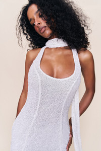 - A halter-style gown with an open back and floor-length silhouette. Designed in a fluid, stretch sequined fabric that moves with the body. The scarf-style tie can be wrapped or knotted at the neck for a customized look. Bold, refined, and effortlessly sensual. - Composition: 95% Polyester, 5% Spandex - Eileen is wearing a size S and is 5'9" with a 32" bust, 35" hips, and 25.5" waist