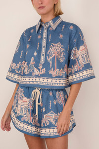 The Alemais Acacia Cropped Shirt in Blue is a short sleeve shirt with cropped silhouette. FIT DESCRIPTION MODEL MEASUREMENTS - Fits true to size, take your normal size - Relaxed crop shirt silhouette - Pointed collar and stand - Half placket with self-covered buttons - Composition: 100% European Linen - Harriet is wearing a size 6/ 2 US - Bust: 32" - Waist: 24" - Hips: 30.5" - Height: 5’8.5”