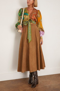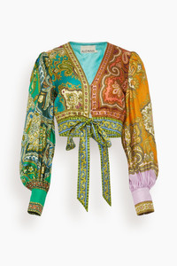 The Alemais Clemenza Spliced Crop Silk Blouse is a standout piece from their Fall 25 Collection. This crop top features a plunging v-neckline and blouson sleeves in a bold printed silk twill. Wear yours with the matching pants and sandals. FIT DESCRIPTION MODEL MEASUREMENTS - Fits true to size, take your normal size - Cropped top - V-neckline - Self tie waist - Blouson sleeves - 100% Silk Twill - Harriet is wearing a size 6/ 2 US - Bust: 32" - Waist: 24" - Hips: 30.5" - Height: 5’8.5”