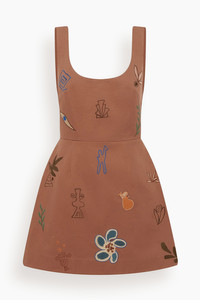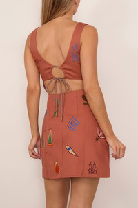 The Alemais Dusty Embroidered Mini Dress in Rust is a sleeveless mini dress with embroidery and artwork created in collaboration with Laurence Leenaert. FIT DESCRIPTION MODEL MEASUREMENTS - Fits true to size, take your normal size - Fitted mini dress silhouette - Square neckline - Tie-up detail at back - Embroidered motifs - Invisible zip at centre back - Composition: 100% Organic Cotton Canvas - For this piece we recommend a cold hand wash. - Charley is wearing a size 6/ 2 US - Bust: 33” - Waist: 25” - Hips: 34” - Height: 5’8”