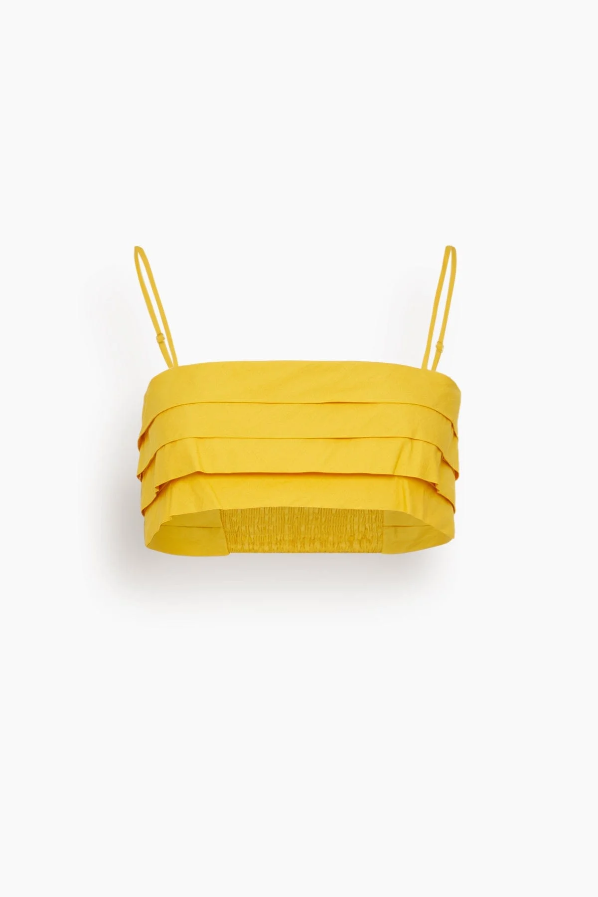 The Alemais Mokshini Top in Yellow is a pleated crop top with spaghetti straps. FIT DETAILS MODEL MEASUREMENTS - Adjustable shoulder straps - Shirred back panel - Composition: 100% Organic Cotton - For this piece we recommend a cold hand wash. - Harriet is wearing a size 6/2 - Bust: 32" - Waist: 24" - Hips: 30.5" - Height: 5’8.5”