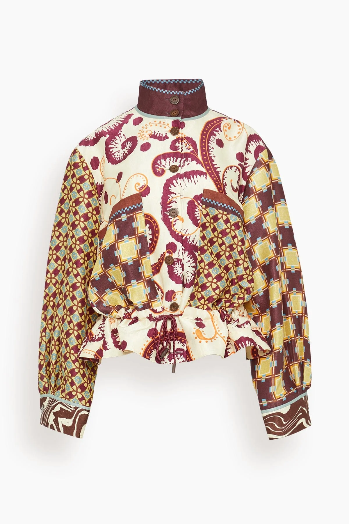 The Alemais Wilson Jacket in Multi is a bomber jacket with funnel neck. FIT DETAILS MODEL MEASUREMENTS - Cuffed sleeves - Patch pockets at chest - Drawstring channel with adjustable bespoke toggles - Composition: 100% Viscose - For this piece we recommend dry clean only. - Celeste is wearing a size 6/2 - Bust: 35" - Waist: 27" - Hips: 36" - Height: 5’10”