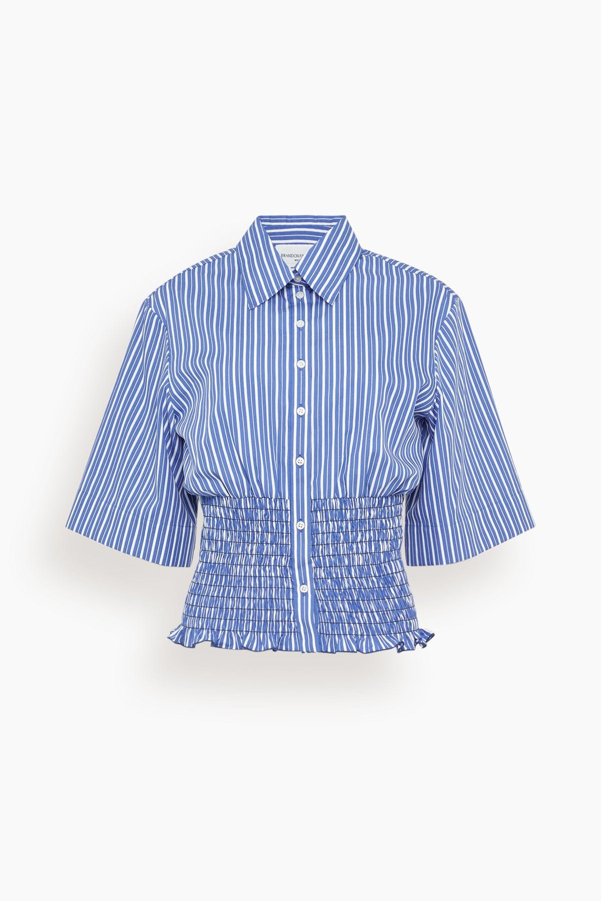 The Brandon Maxwell Harte Button Up Shirt will be in your wardrobe for years to come. This button down shirt features a smocked waistband in a bright striped cotton poplin. Wear yours with the matching skirt and sandals. FIT DESCRIPTION MODEL MEASUREMENTS - Fits true to size, take your normal size - Button down shirt - Cropped length - Smocked waistband - Wide sleeves - 100% Cotton - Harriet is wearing a size 2 - Bust: 32" - Waist: 24" - Hips: 30.5" - Height: 5’8.5”