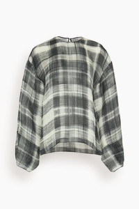 The Brandon Maxwell The Briggs Relaxed Blouse with Balloon Sleeves in Smeared Plaid is an oversized blouse with balloon sleeves and lightweight silk twill. - Long sleeves - Oversized fit - Keyhole and button closure at back - 100% Silk
