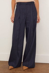 The Dorothee Schumacher Modern Sophistication Pants are a timeless addition to your wardrobe. These pants feature a tailored, wide leg in a pinstripe linen blend. Wear yours with the matching blazer and heels. FIT DESCRIPTION MODEL MEASUREMENTS - Fits true to size, take your normal size - Wide leg - High rise - Tailored silhouette - Front pleats - 52 % Linen, 45 % Viscose, 2 % Elastane, 1 % Polyester - Charley is wearing a size 1/ XS - Bust: 33” - Waist: 25” - Hips: 34” - Height: 5’8”