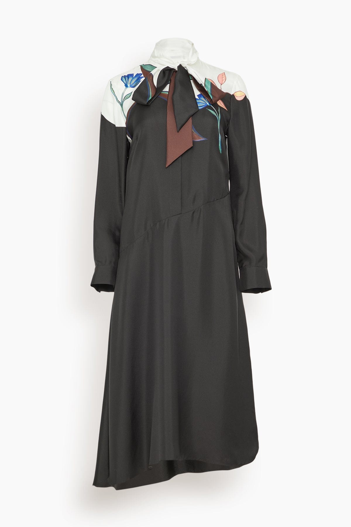 The Dorothee Schumacher Seductive Bloom Dress is a beautiful piece from their Fall 25 Collection. This silk dress has a flowing silhouette with an autumnal floral print across the top. Wear yours with boots and a shoulder bag. - Shirtdress - Midi length - Half button placket - Loose fit - Removable scarf - Asymmetrical hemline - 100% Silk