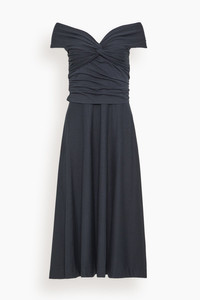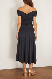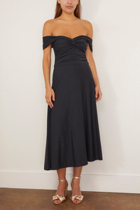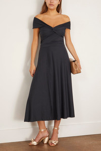 The Dorothee Schumacher Soft Drape Dress is crafted in a lightweight cotton-jersey mix. You'll love the flattering off the shoulder neckline of this midi dress with a swing skirt. Wear yours with sandals and a shoulder bag. FIT DESCRIPTION MODEL MEASUREMENTS - Fits true to size, take your normal size - Midi length - Off the shoulder - Draping - Swing skirt - 50 % Viscose, 45 % Cotton, 5 % Elastane - Emma is wearing a size 1/ XS - Bust: 32” - Waist: 25” - Hips: 34” - Height: 5’7”