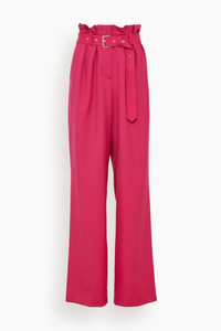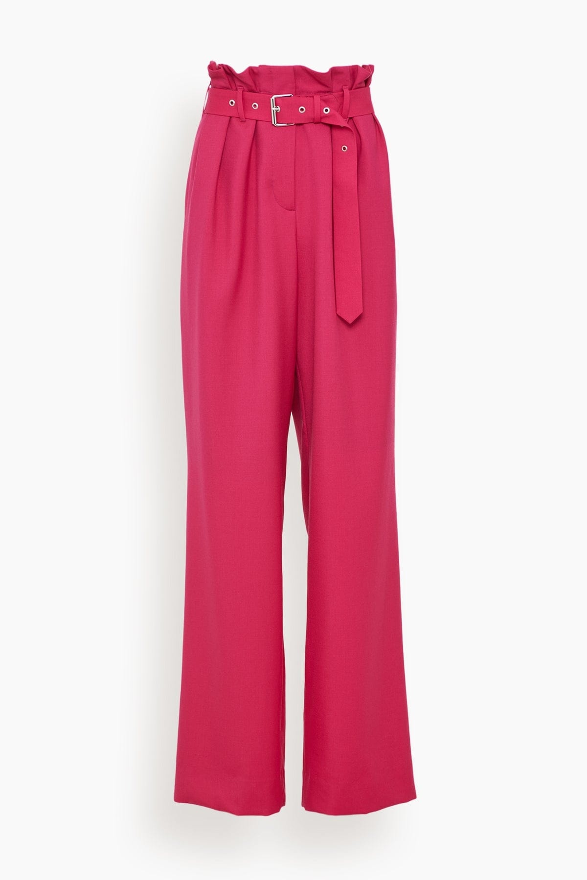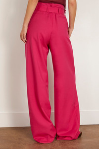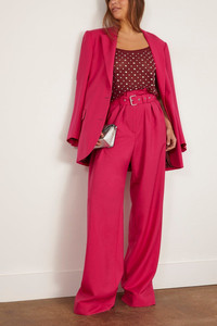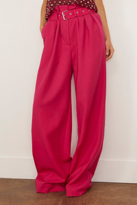 The Dries Van Noten Peaches Pant in Fuchsia is a loose fit high-waisted belted trousers with irregular pleats, in wool mohair twill. FIT DESCRIPTION MODEL MEASUREMENTS - Fits true to size, take your normal size - 83% Wool, 17% Mohair. - Loose fit. - High rise. - Straight leg. - Pleated. - Side slit pockets and back jetted pockets. - Belted. - Front closure. - Emma is wearing a size 34/ 2 US - Bust: 32” - Waist: 25” - Hips: 34” - Height: 5’7”