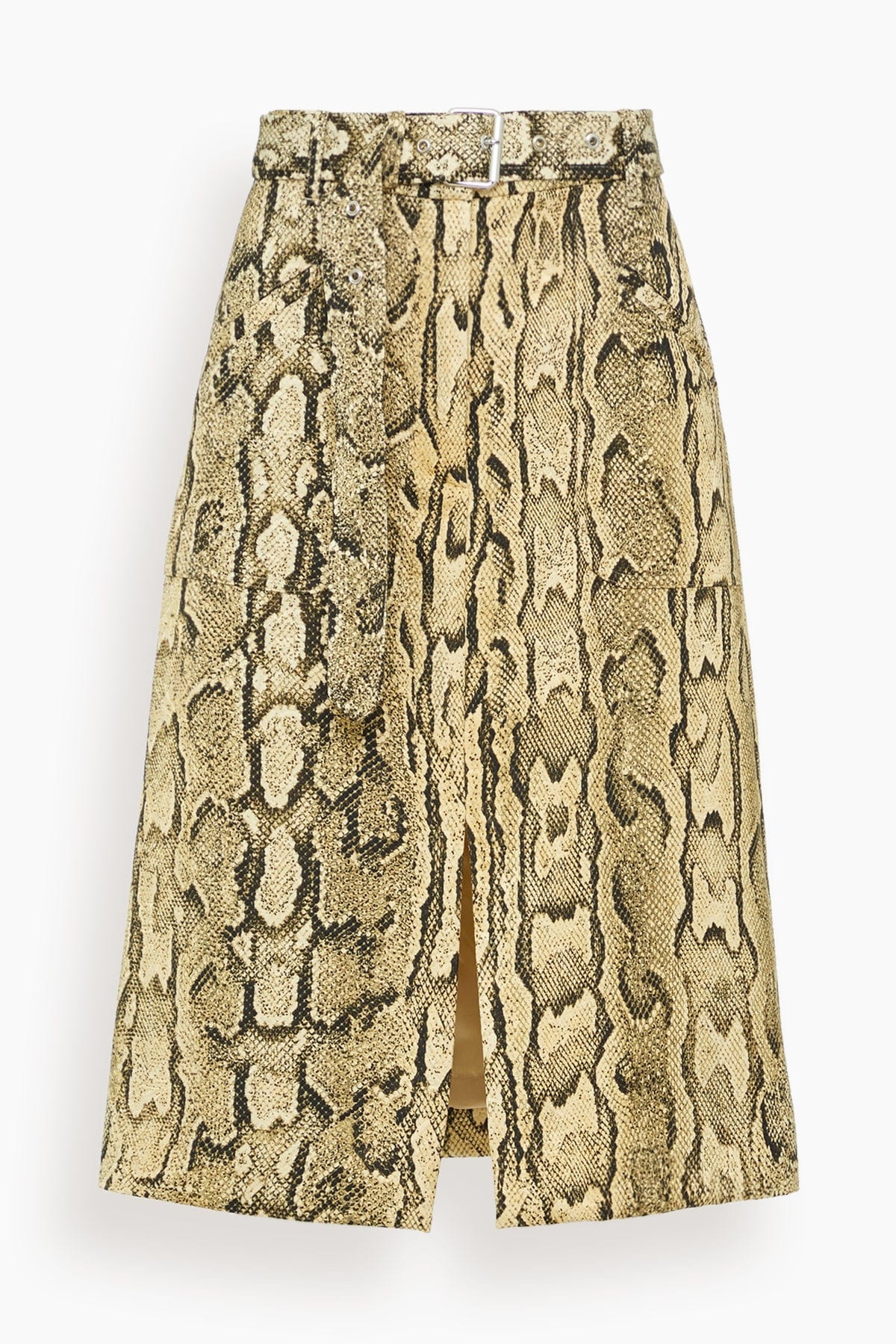 The Dries Van Noten Sheraz Skirt in Snakeprint is an a-line knee length belted skirt in viscose cotton jacquard, with front slit and patch pockets. FIT DESCRIPTION MODEL MEASUREMENTS - Fits true to size, take your normal size - 64% Viscose, 36% Cotton. Lining: 100% Viscose - Printed jacquard python-snakeprint piping. - Regular fit. - A-line. - Knee length. - Front slit. - Side slit pockets. - Belted. - Front zip closure. - Harriet is wearing a size 34/ 2 US - Bust: 32" - Waist: 24" - Hips: 30.5" - Height: 5’8.5”