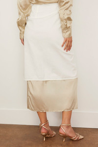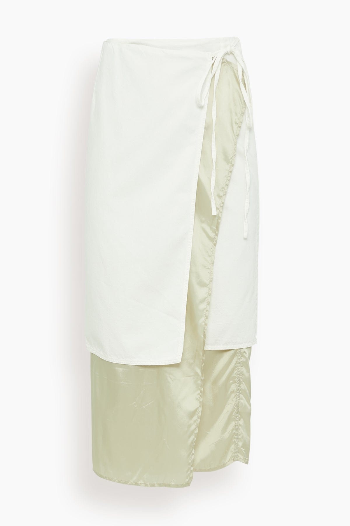 The Dries Van Noten Silene Denim Skirt in Off White is a double layer wrap skirt with contrast panels, in lightweight rinsed indigo denim. FIT DESCRIPTION MODEL MEASUREMENTS - Fits true to size, take your normal size - 50% Lightweight Cotton, 50% Viscose. - Overdyed denim. - Double layered. - Contrast panels. - Regular fit. - Midi length. - Side button and tie closure. - Emma is wearing a size 34/ 2 US - Bust: 32” - Waist: 25” - Hips: 34” - Height: 5’7”