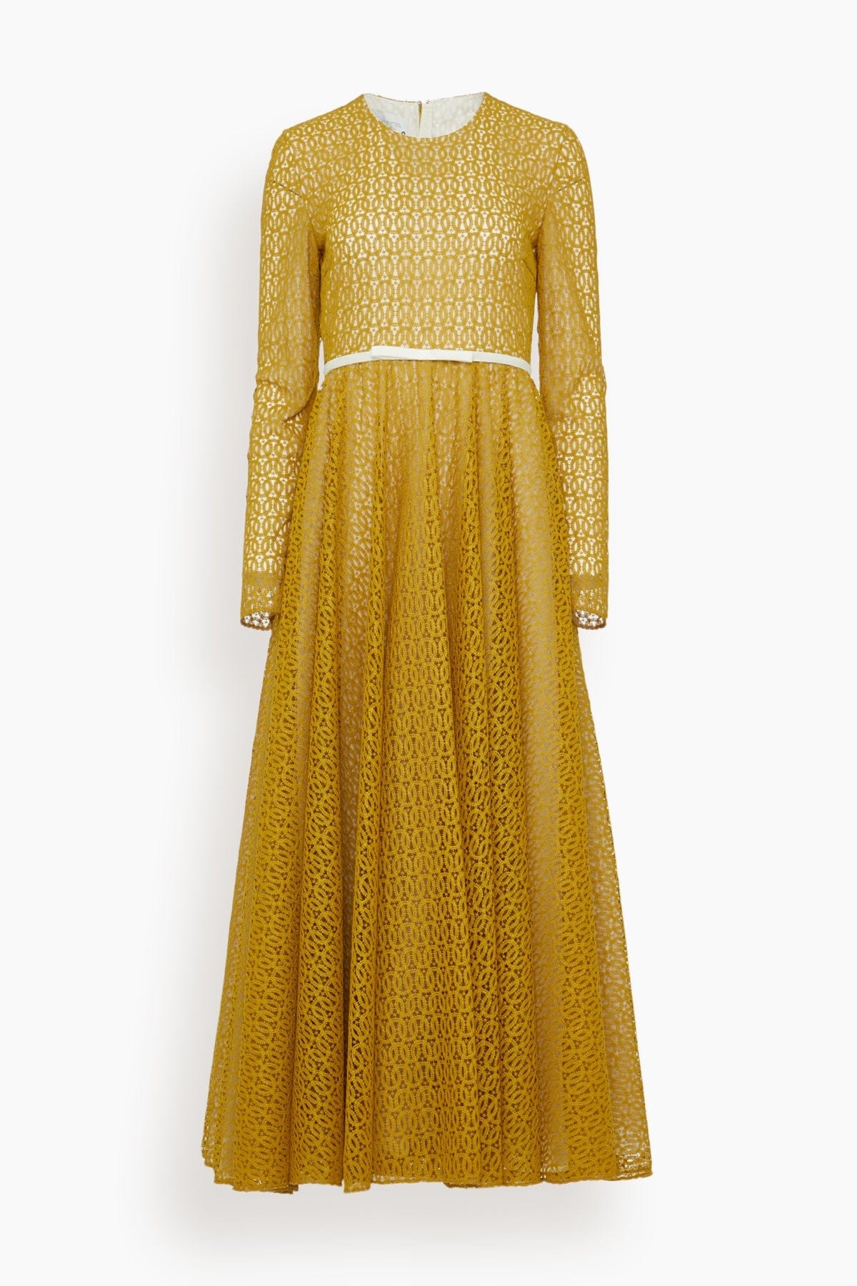 The Giambattista Valli Ribbon Macrame Dress in Mustard is a long sleeve maxi dress with macrame design and bow detail at the waist. FIT DESCRIPTION - Maxi length - Long sleeves - Crew neck - Concealed back zip closure - Lined - Bow detail at the waist - 100% Polyester