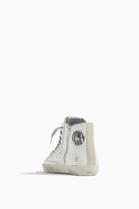 The Golden Goose Francy Sneaker feature the signature distressed detailing you love from this designer. These high top sneakers have a zip up side with a glitter adorned star and laces. - Fits true to size, take your normal size - Those in-between sizes should size up - High top sneakers - Zip side - Distressed detailing - Rubber sole - Leather upper - Made in Italy