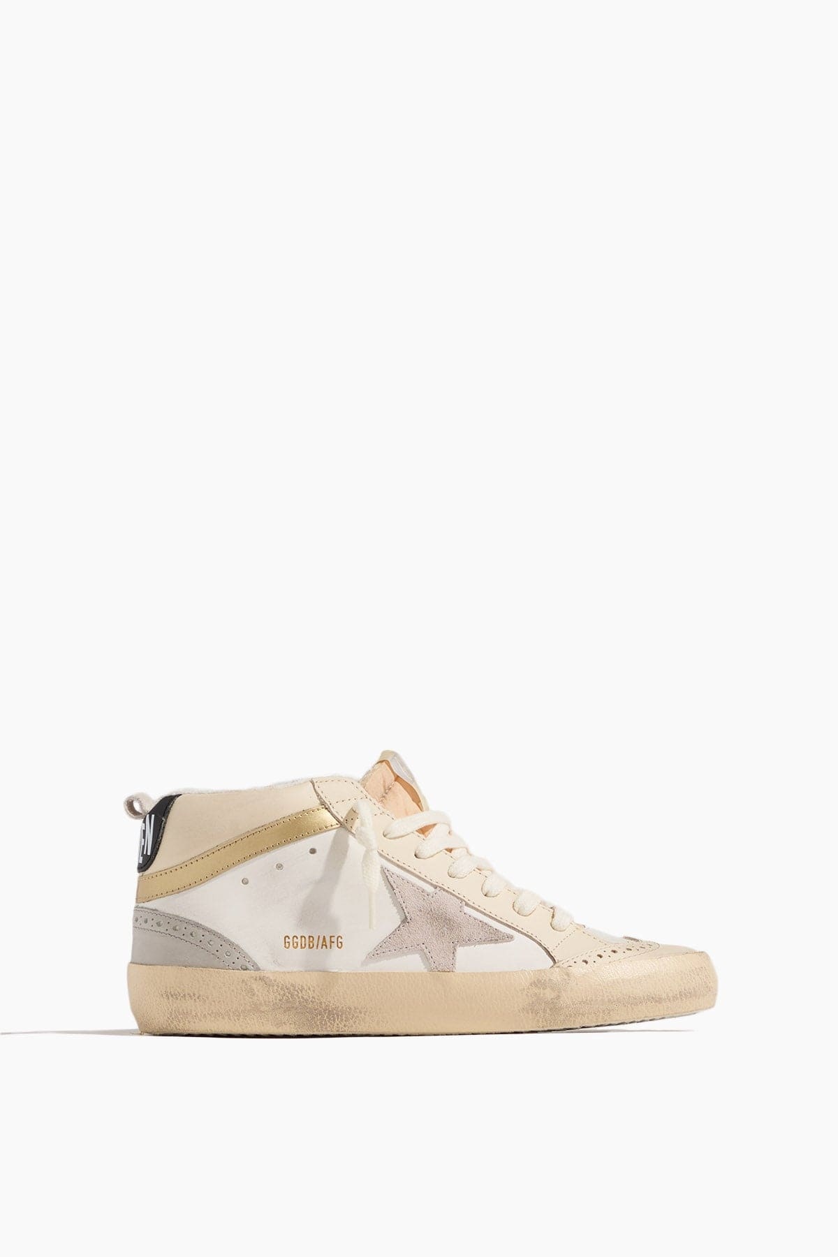 The Golden Goose Mid Star Sneaker in White/Ivory/Light Lilac/Light Grey/Gold/Black features their signature distressing. You'll love the high top and subtle metallic details of these sneakers. FIT DETAILS - High top sneakers - Lace up front - Distressing - Round toe - Rubber sole - 80% cow leather, 10% polyester, 10% textile polyurethane