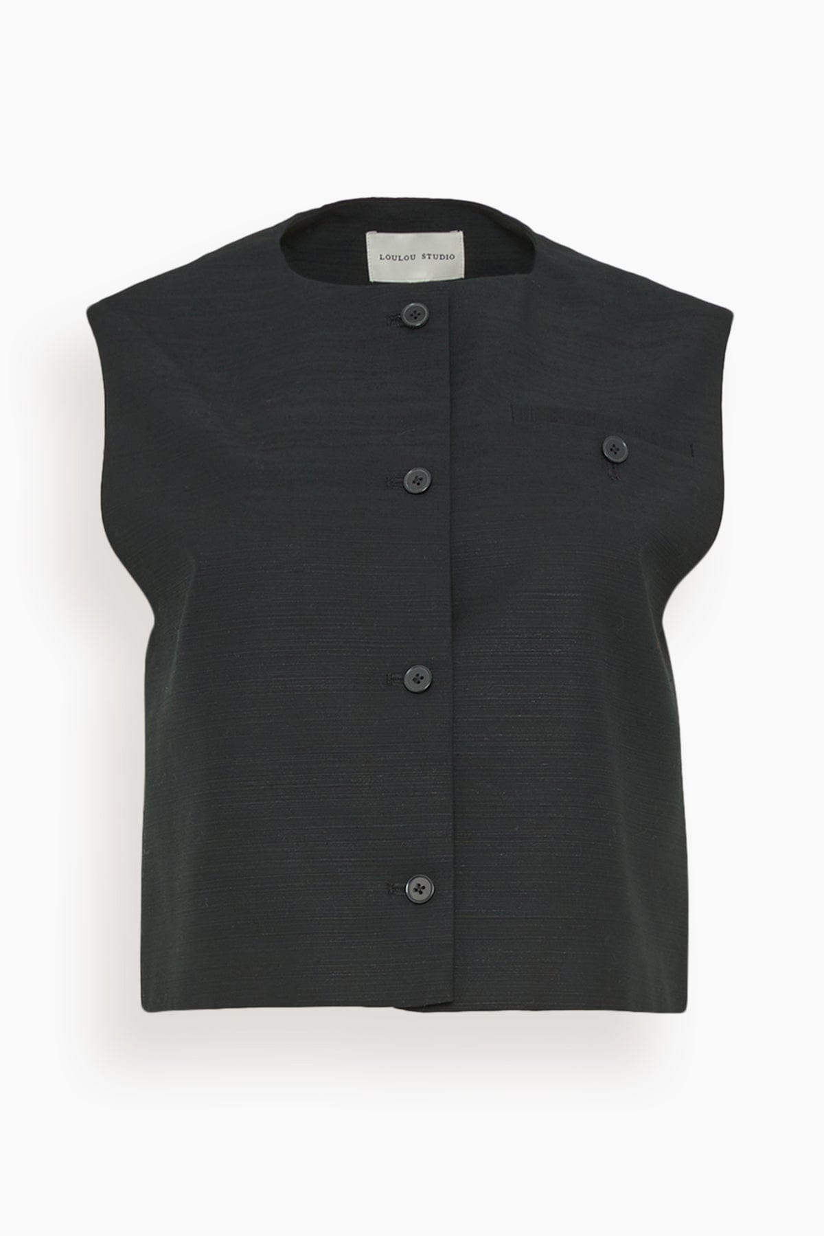 The Loulou Studio Esme Round Neck Vest features the simplistic details you love from this designer. This vest has a boxy silhouette and cropped length. Wear yours with trousers and flats. FIT DESCRIPTION MODEL MEASUREMENTS - Fits true to size, take your normal size - Vest - Boxy silhouette - Cropped length - Crew neckline - 100% viscose - Charley is wearing a size 34/ 2 US - Bust: 33” - Waist: 25” - Hips: 34” - Height: 5’8”