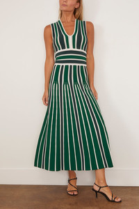 The Max Mara Tallone Knitted Dress is the perfect transitional piece to add to your wardrobe. This midi dress has a classic fit and flare silhouette in a beautiful, bold vertical stripe. Wear yours with flats and a shoulder bag. FIT DESCRIPTION MODEL MEASUREMENTS - Fits true to size, take your normal size - Midi length - Fit and flare silhouette - V-neckline - Wide waistband - Stretch material - 62% viscose, 38% polyester - Charley is wearing a size XS - Bust: 33” - Waist: 25” - Hips: 34” - Height: 5’8”