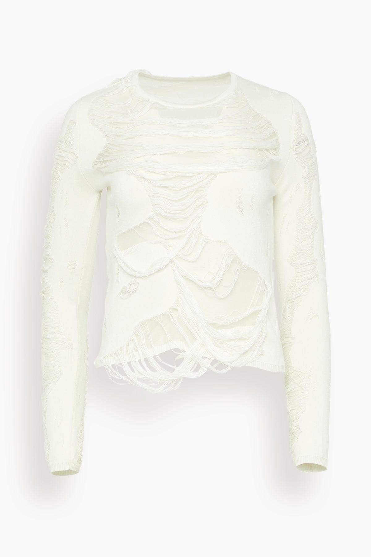 The MM6 Maison Margiela Crewneck in Off White features the unique details you love from this designer. This top has extreme distressing with a slim silhouette. Wear yours with jeans and sandals. - Long sleeve t-shirt - Distressing - Crew neckline - Slim silhouette - 97% Cotton, 3% Polyamide