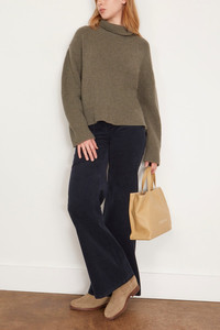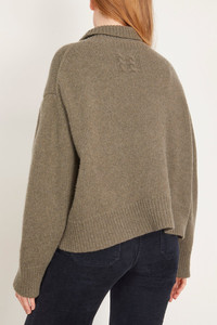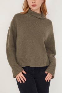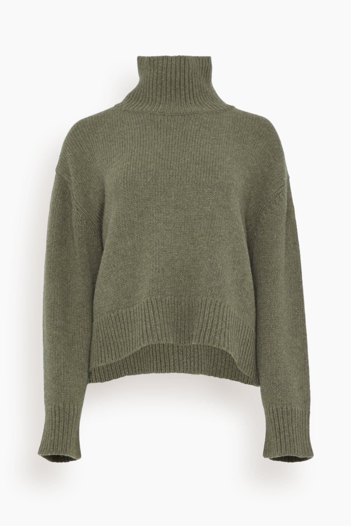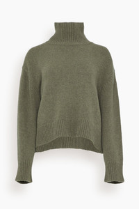 The Nili Lotan Omaira Sweater in Army Green is a heavyweight relaxed boxy funnel neck sweater in Italian lambswool. Features a high neck that is designed to be worn up, but easily able to fold over. FIT DESCRIPTION MODEL MEASUREMENTS - Fits true to size, take your normal size - Dropped shoulder - Ribbing along neck, sleeve and hem - Signature center back cable knit detail - Fully fashioned along arm hole and shoulder - 100% LAMBSWOOL - Anna is wearing a size XS - Bust: 33" - Waist: 25" - Hips: 37" - Height: 5’9”