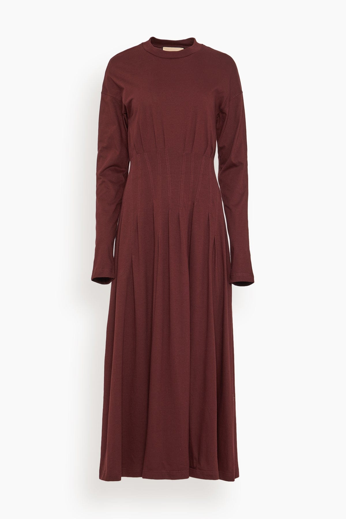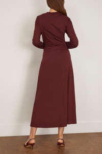 The Plan C Long Dress in Dark Burgundy will quickly become a staple in your fall wardrobe. This midi dress is crafted in the perfect shade of burgundy with a cinched waistband. Wear yours with clogs and a shoulder bag. FIT DESCRIPTION MODEL MEASUREMENTS - Fits true to size, take your normal size - Midi length - Cinched waistband - Crew neckline - Relaxed fit - 100% Cotton - Rayna is wearing a size 38/ 2 US - Bust: 34” - Waist: 24” - Hips: 32” - Height: 5’8.5”
