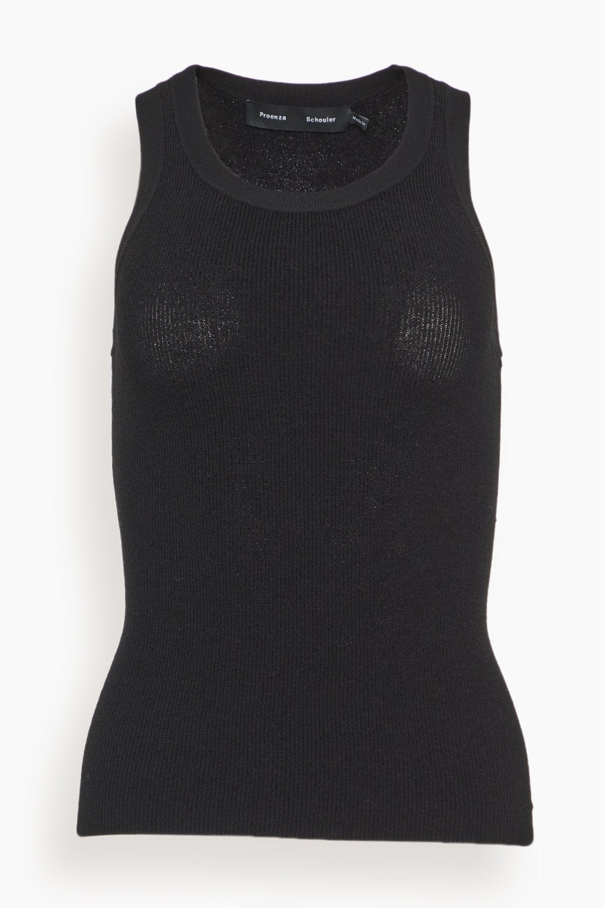 The Proenza Schouler Roberts Rib Top will quickly become a staple in your wardrobe. This ribbed knit tank features a slim silhouette with a racerback. Wear yours with trousers and a jacket. FIT DESCRIPTION MODEL MEASUREMENTS - Fits true to size, take your normal size - Ribbed tank - Slim silhouette - Racerback - Scoop neckline - 83% viscose, 17% polyester - Kyndal is wearing a size XS - Bust: 32" - Waist: 24" - Hips: 35“ - Height: 5’6”