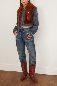 Denim Jacket with fur body and collar includes front zippers on each side. Made with comfort stretch 13 oz. Japanese indigo denim and a heavy wear pattern. FIT DESCRIPTION MODEL MEASUREMENTS - Bust: 32” - Waist: 25” - Hips: 34” - Height: 5’7”